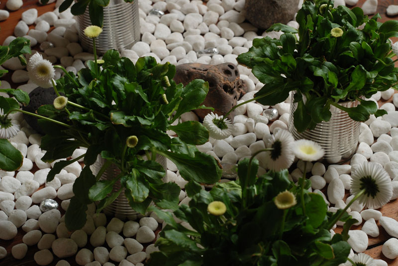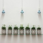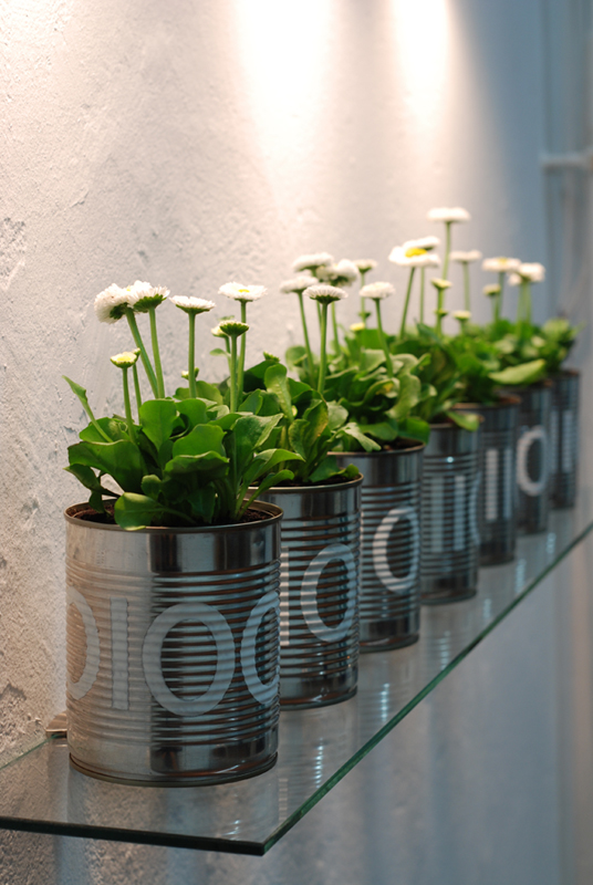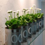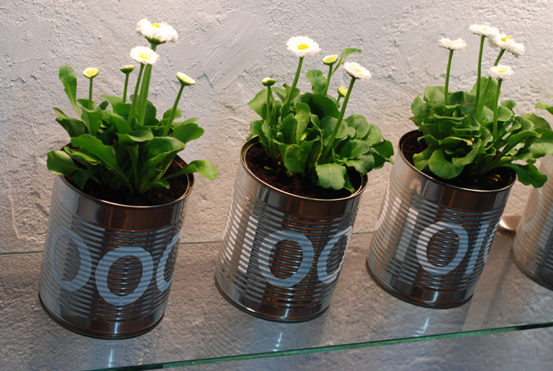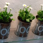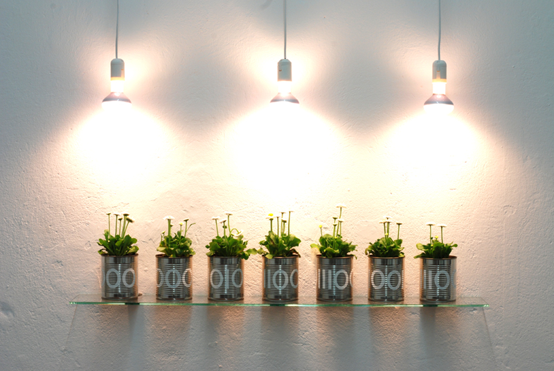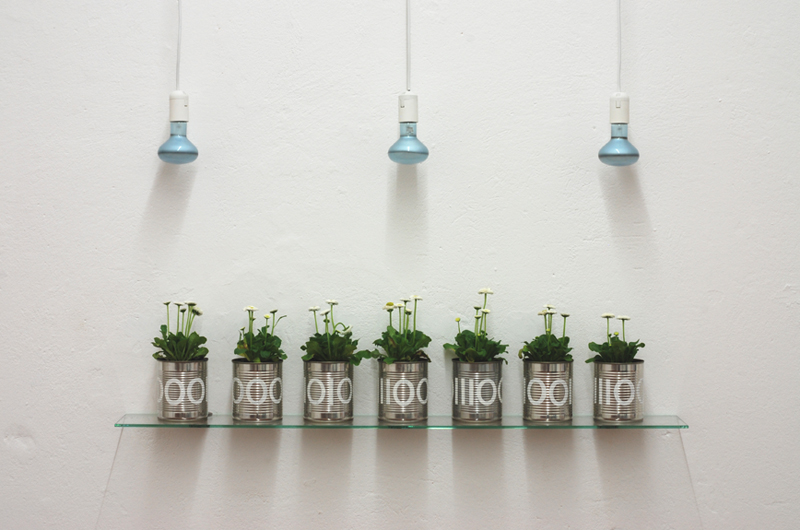 The binary code for daisies is painted on 7 standard industrial tin cans. The generic term is represented as binary code and singular plants (DNA).