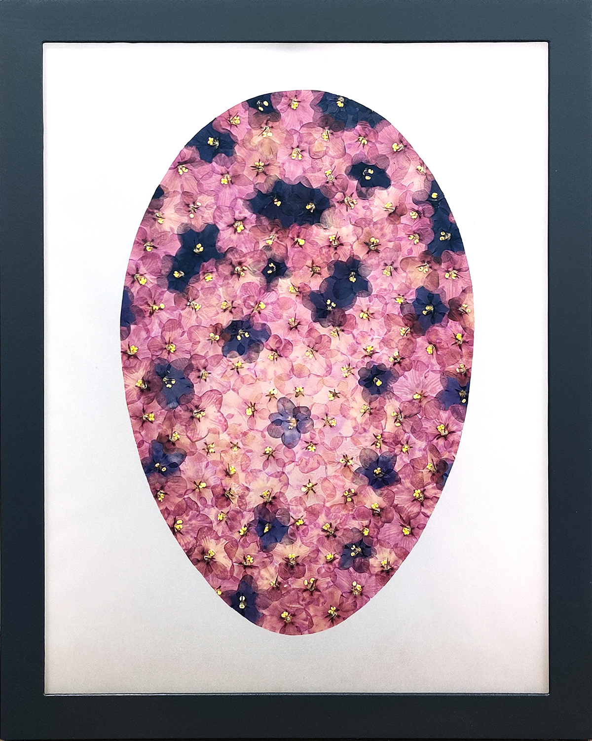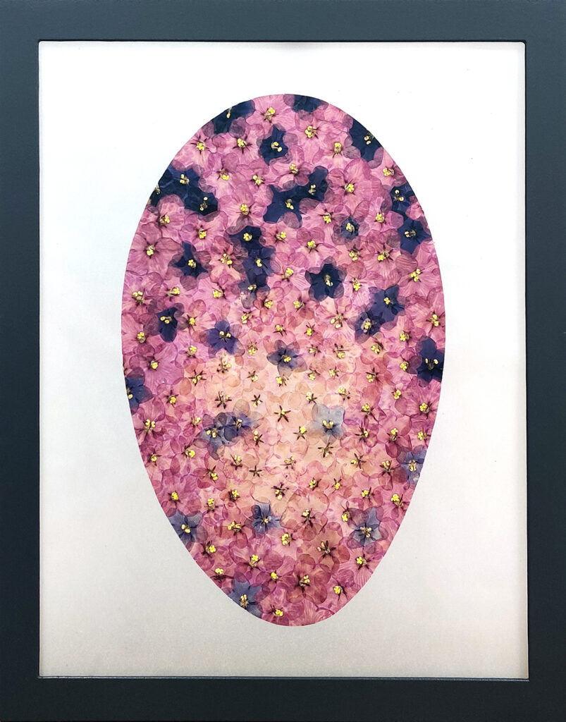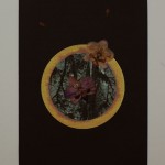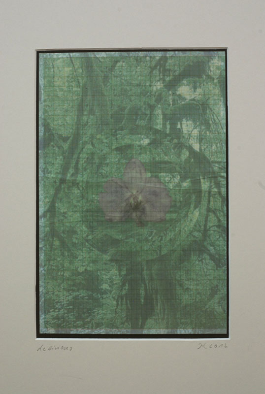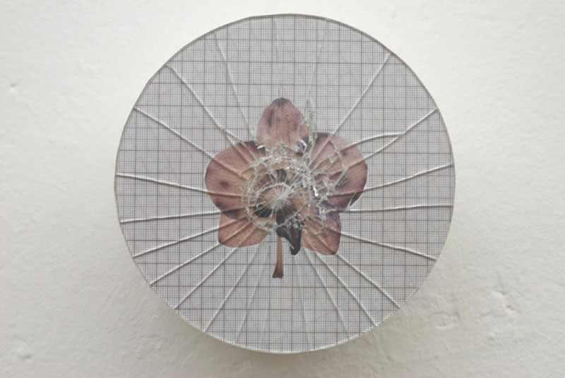 In migrating, individualized societies we can observe a growing longing for being part of social groups, families, tribes. For „Faceless Portraits“ i made colour-patterns – refering to family or tribal colours – by extracting 4 colours from digital potraits of friends and printed them as millimeter patterns on paper and transparent foil. I chose orchidblossoms representing the singular individual, fixed them between the opaque and the transparent layers and behind a broken glass. My aim was to create an image of the fragility of the individual in individualized societies.