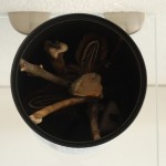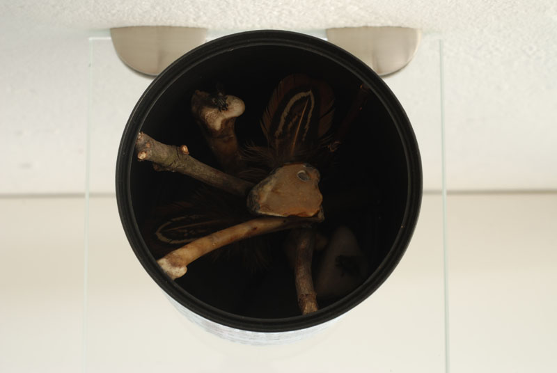 15 X 15 x 12 cm, tin can, glass board, stones, wood, bones, feathers, flies
