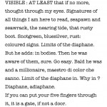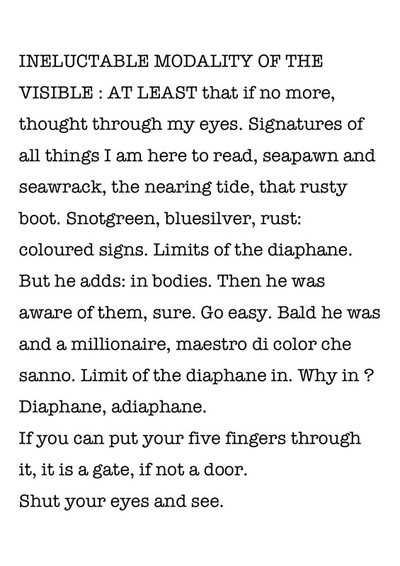 On a second, transparent and almost ephemeral level, she presents a text by James Joyce about the „ineluctutable modality of the visible“. Limits of perception and the body occur – the relation of what we see and who we are. The intellectual and reflective level.