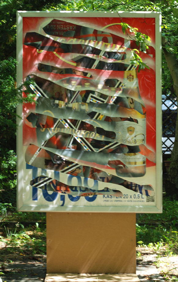 The installation is made of 3 mirrors from polished stainless steel. There formats are 30 X 45 cm, 25 X 50 cm and 20 X 60 cm. They are placed at the verge of a forest, looking at a panoramic view. The recipient moves at the interface of nature and image. He can choose his angle of view – select his motif -, but he will also experience the limitations set by the defind cut-outs.