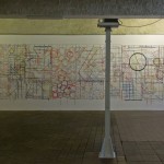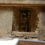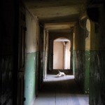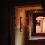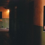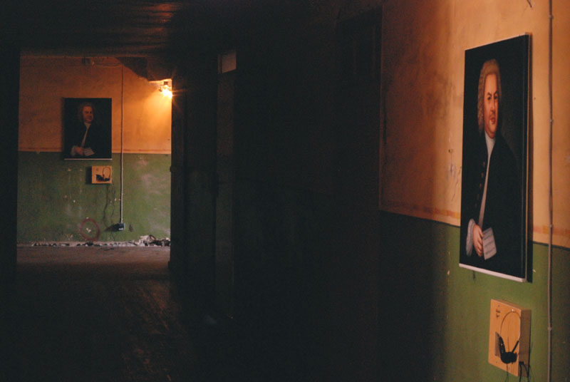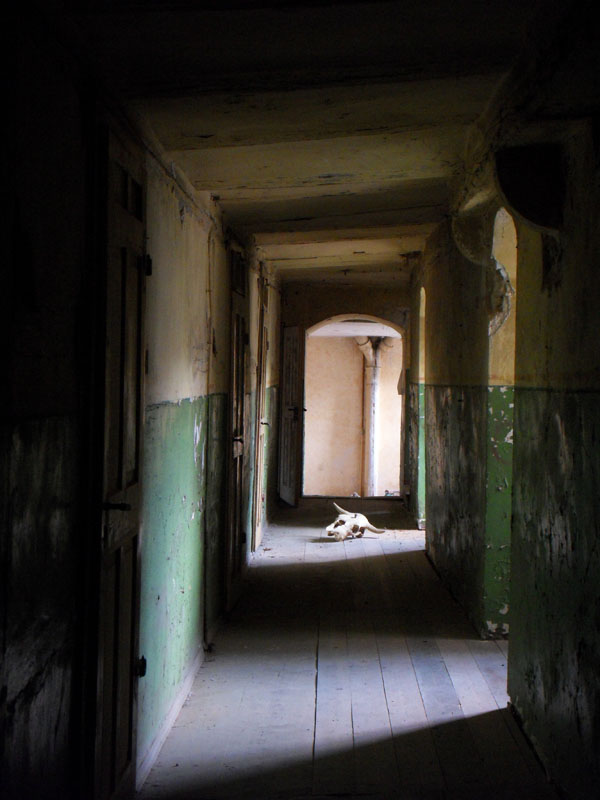 In an other hallway, that was closed for safety reasons, he placed the a bovine skull in a light spot on the ground. Evoking emblematic associations of death and desert he transformed the no-go-area into a picture of a house with a great potential as a fallow land.