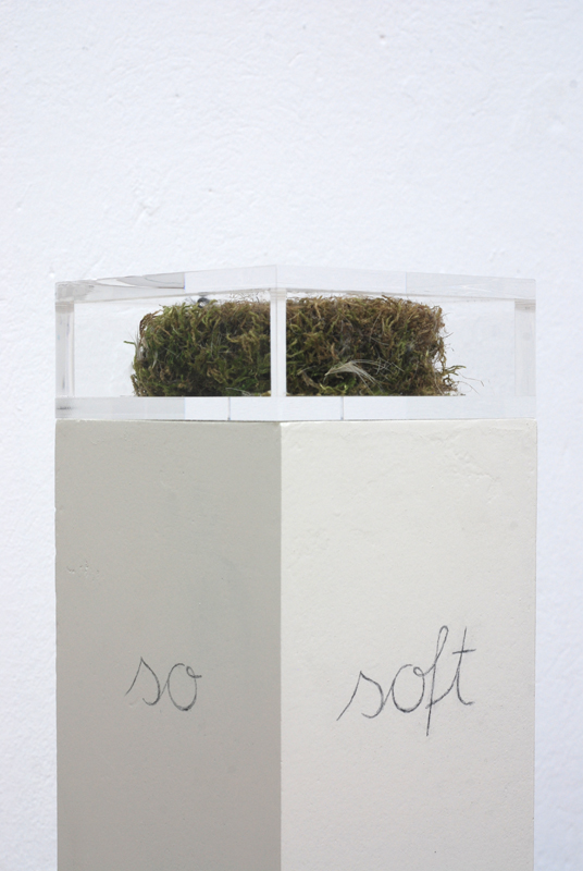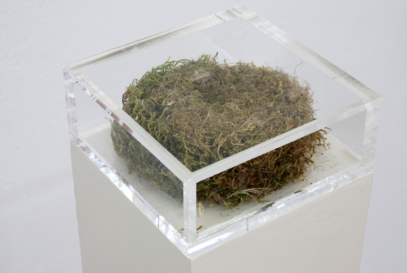 Preserving and presenting it in a sealed acrylic glass display, excludes us forever from the tactile sensation, that is now humbly replaced by the description on the pedestal – so soft and cosy -. A work about preservation and representation taking away the main quality of the preserved and presented object and a memorial for the tiny birds and their devotion to life. – I hope they give me the honour again next spring –