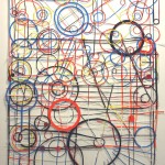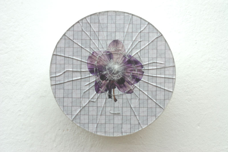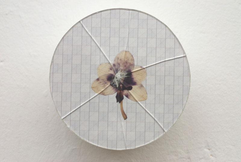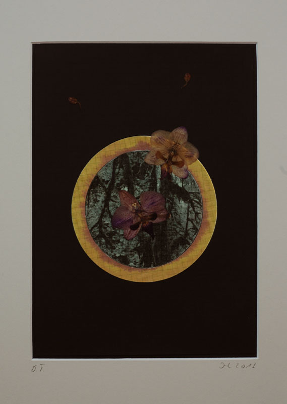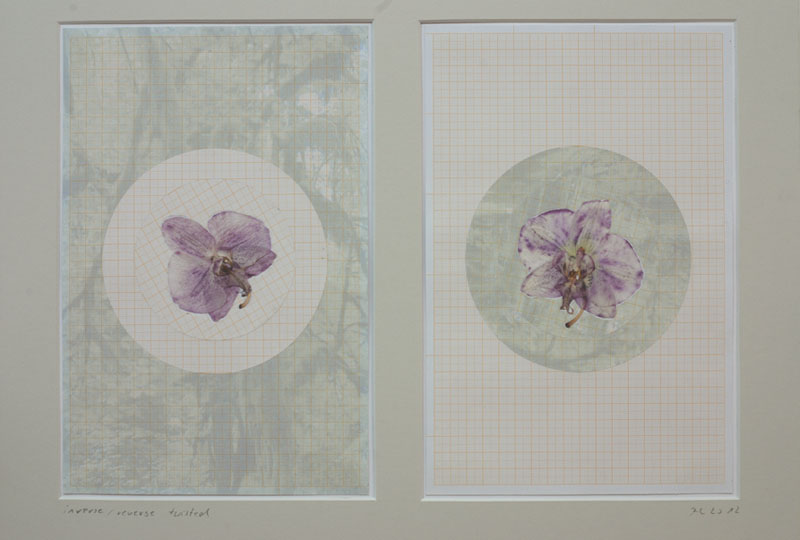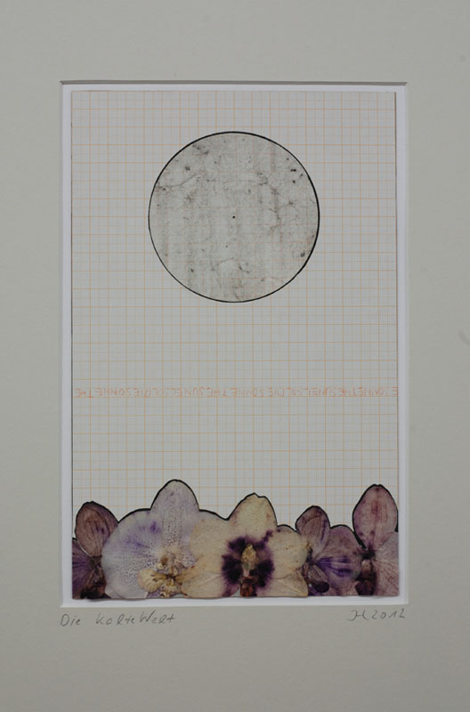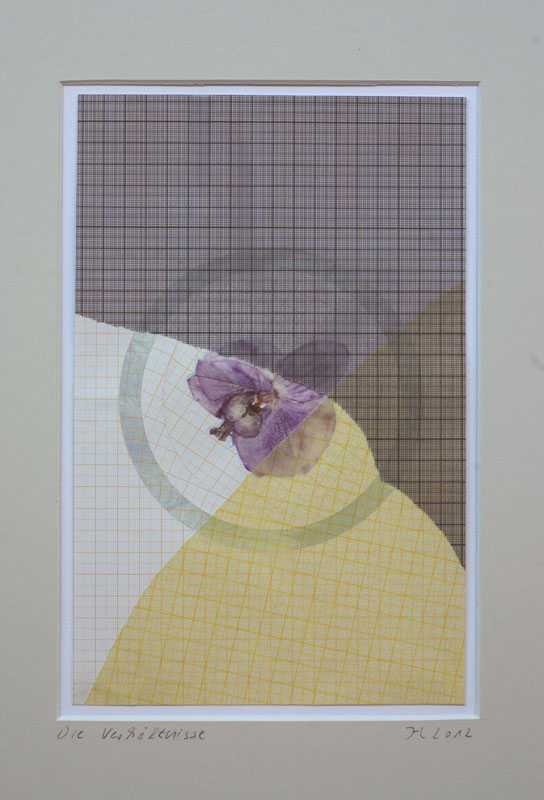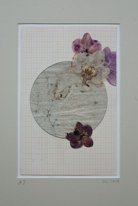 A series of collages based on the stock: millimeter-paper (basic pattern), circles (symbol, irrational (π)) and orchidblossoms (liveliness, variety). The stock is recombined in changing constellations. The resulting works oscillate between semiotic, formal investigation and poetic findings.