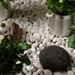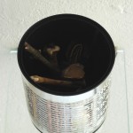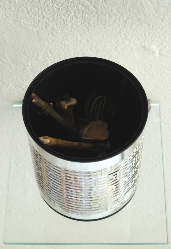 On a second level, the decoded content of the binary writing: S.T.O.N.E.S.W.O.O.D.B.O.N.E.S.F.E.A.T.H.E.R.S.F.L.I.E.S. connects this thoughts about the creation of signs, patterns and value with a little installation inside the can, where these materials are assembled in a finely balanced situation that cites the aesthetics of animistics shrines. The material claims its immanent value and the object as a whole becomes transcended.