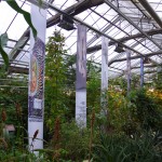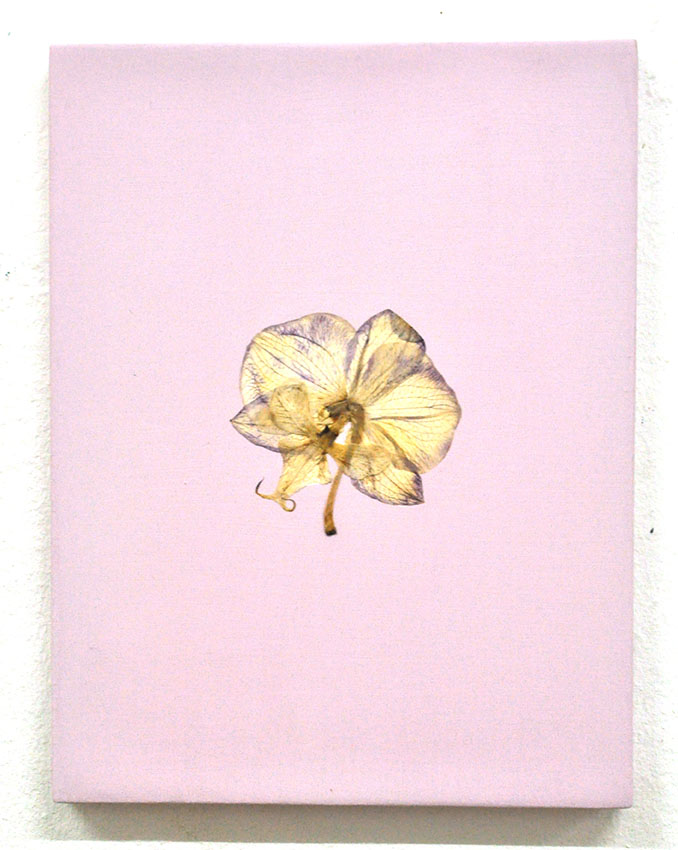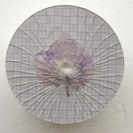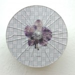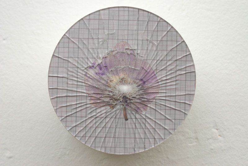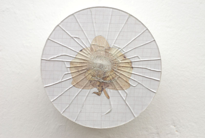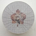 wall-installation, glass, orchidblossoms, printed millimeter patterns, foil, cardboard tube,