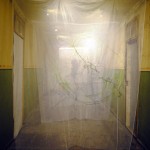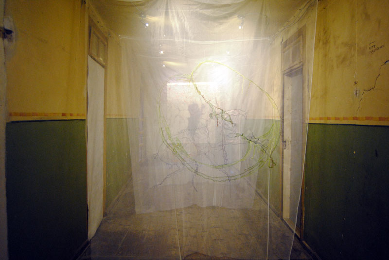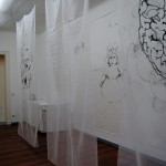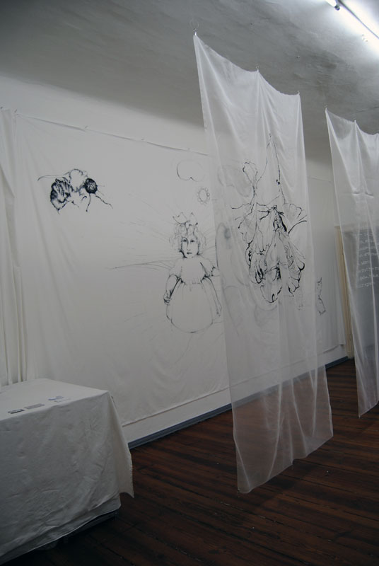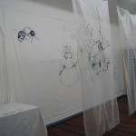 Drawings and writing on cotton and transparent silk 600 X 280 X 150 cm