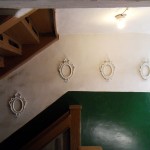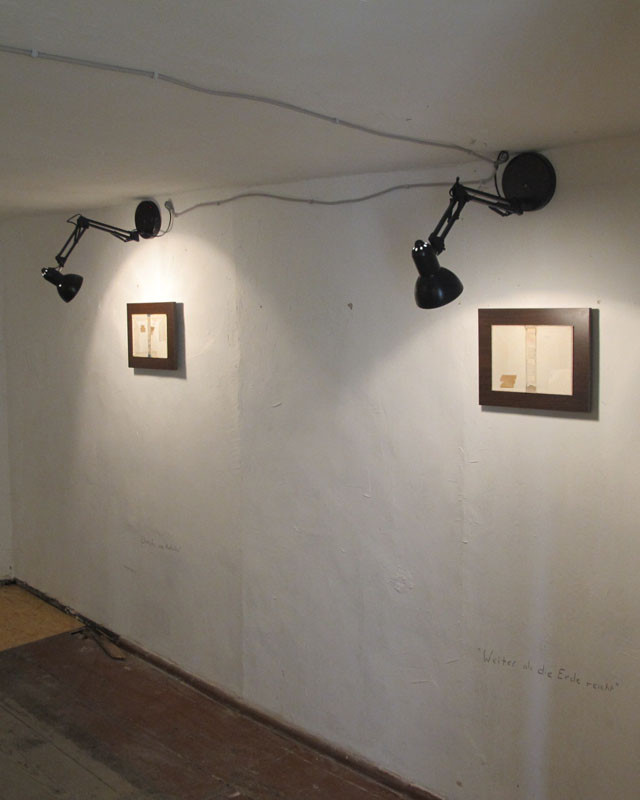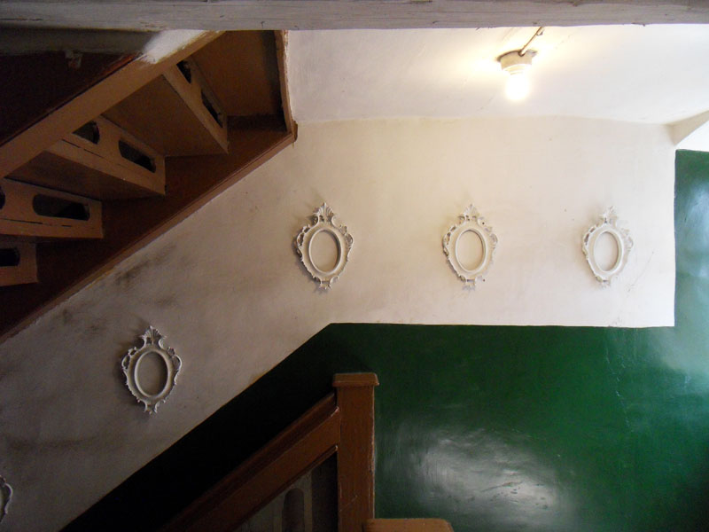 Frank Benno Junghanns created site-specific installations for the exhibition. In the staircase and the first hallway he placed a sequence of empty frames on the walls. Resembling a gallery of absent ancestors, the frames frame nothing but the structure of the walls, so underlining the function of the building as an influential part of the exhibition and its perception.