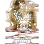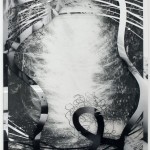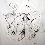 Karina Mosegård reinterprets the arthistorical genre „Nature Morte“. Still life – in french „Nature Morte (dead nature) – is a style in photografy and painting working with the compostition of inanimated objects. Karina Mosegard technically enhances the concept by embroidering the objects on transparent cloth and place one behind the other. The drawings are floating in space, slightly distorted, almost uncapable, in a process of decomposition. Opposing this, the different layers merge into a new image, new images, and so generate a process of becoming.